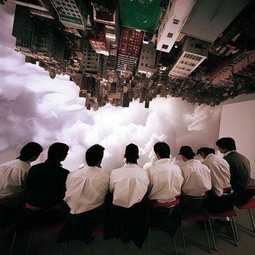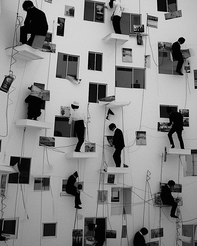 Social arrangement, Blumquist proposes, is always choreography, and making it visible strips the authority it borrows from looking natural. Blumquist comes from music, and the compositional logic is audible: distribution, spacing, tempo, return. The score becomes legible. Dark-suited figures sit in spaced chairs while a city hangs inverted above them. Bodies arc through blue sky in formation, falling without panic past an apartment building. A stepped white structure distributes people across its ledges like notation on a staff; a white wall reduces each figure to a node on a shelf among photographs and wires. The theatrical works push the frame into the open: an audience seated amid debris faces a proscenium opening onto a painted landscape, stage machinery visible, set holding. The population scenes (hundreds on a green hillside under a night sky, bodies bending and reaching in a shallow sea) keep the choreography but withdraw its purpose. Nobody announces the score. People follow it anyway.