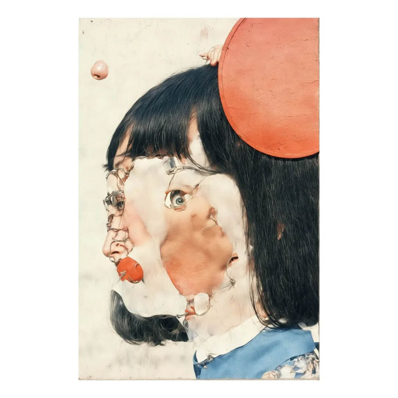 What registers first is obstruction, and it is specific. A cobalt panel bisects the centreline where the eyes should meet yours. Wire mesh grids a forehead. Red-orange discs stamp the cheeks the way a seal stamps a document, posting the terms of access. In several works, dense collaged scenes of small figures fill the silhouette where a body should be, as though the self were a site occupied by others rather than a single legible subject. The back-view portraits shift the refusal entirely: the face is withheld, and braids, sculptural, architectural, carrying more compositional weight than the features they replace, become the portrait's subject. Flat, clinical backgrounds decline atmospheric softening. Each intervention reads as decision. What holds the set is a sustained refusal: the portrait owes the viewer nothing it has not chosen to give.